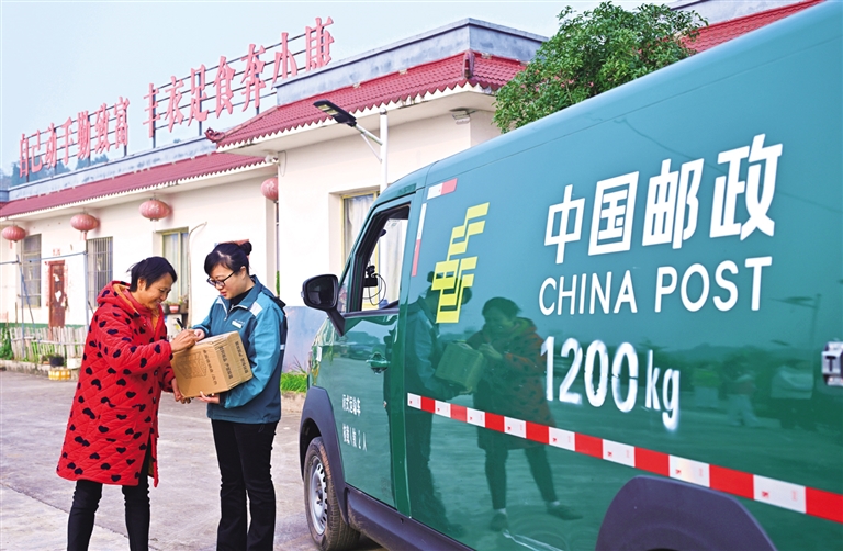 12月1日,在四川省眉山市仁寿县珠嘉镇三溪社区,快递员上门投送包裹。