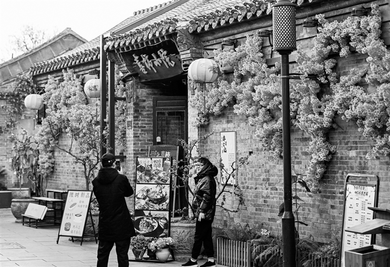 12月3日,游客在天津杨柳青古镇游玩拍照。冬日里,天津杨柳青古镇古韵悠长。游客漫步古运河畔,逛古镇、赏非遗,尽享慢时光。 新华社记者 赵子硕 摄