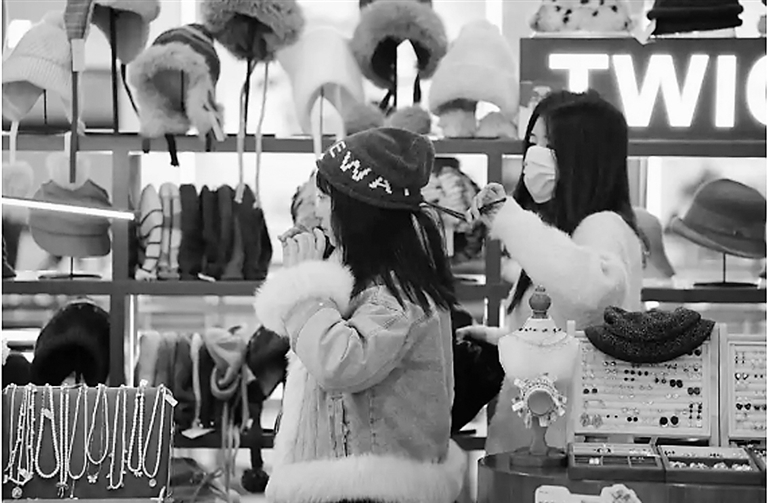 在北京市西城区一家商场,一名女士在选购冬帽。