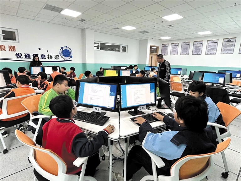 ◀曲阳县首届机器人智能设计挑战赛现场,选手们编写和调试程序代码。 王芳 摄