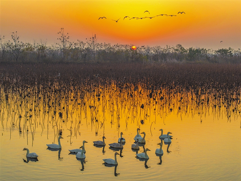 11月30日,群鸟在江苏兴化里下河国家湿地公园内栖息、觅食(无人机照片)。