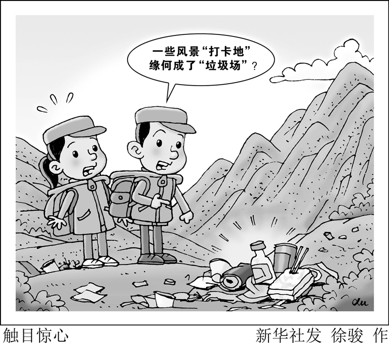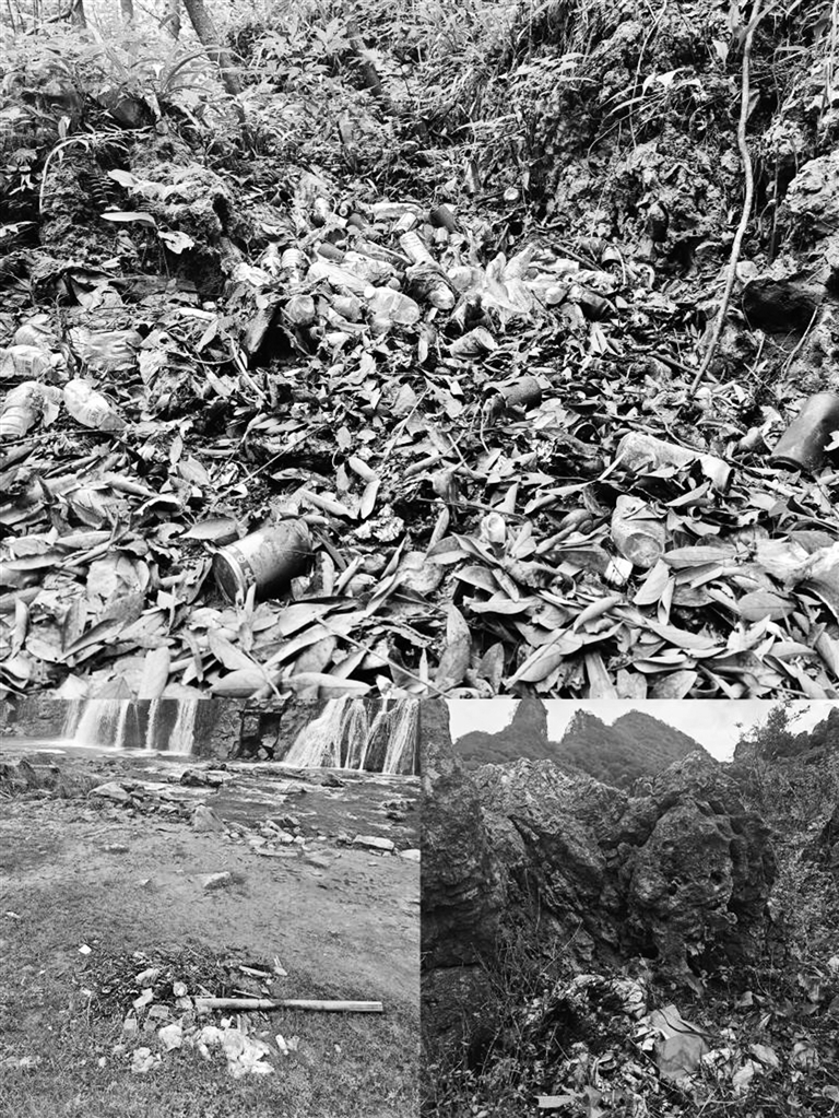 在贵州某县通往一处瀑布的山路两侧及瀑布下方的观景区域,果皮、塑料水瓶等垃圾随处可见;在华北某地郊区一处登山步道,尽管设置有“垃圾带下山,环保在心间”等劝导标语,但纸屑、口罩、玻璃瓶、饮料瓶等垃圾依旧散落林间。