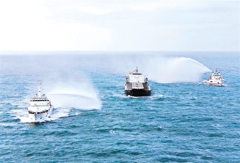 12月6日,福建海事局“海巡06”轮和东海救助局“东海救115”轮开展运输船失火救援演练。
