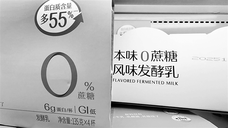 ◀12月4日,在北京某商超酸奶冷柜中,带有“0蔗糖”等标签的商品占据主流位置。