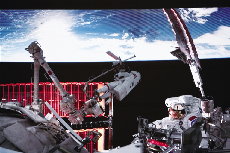 这是12月9日在北京航天飞行控制中心屏幕上拍摄的神舟二十一号乘组航天员张陆与武飞(右)在舱外工作的画面。 新华社记者 刘艺 摄