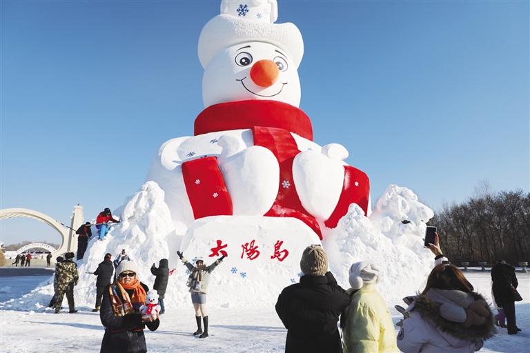 12月9日拍摄的“雪人先生”。当日,第38届太阳岛雪博会标志性雪塑景观“雪人先生”在哈尔滨太阳岛风景区正式亮相。“雪人先生”高23.8米,用雪量达5000立方米。 新华社发(王东 摄)