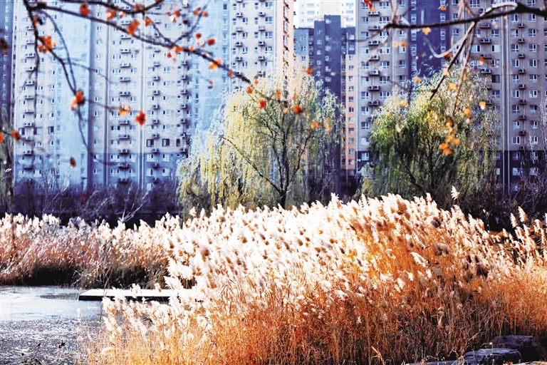 12月的黄花沟公园,湖畔芦花泛着暖黄,冰面初凝。远处,城市住宅与公园设施相映,寒枝挂红叶,草径搭素篷,展现出都市冬日里,自然萧瑟与生活气息交融的日常图景。
