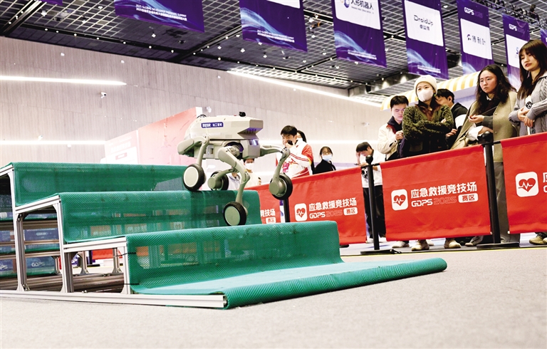 图为当日轮式机器人在应急救援竞技场演示快速爬楼梯技能。