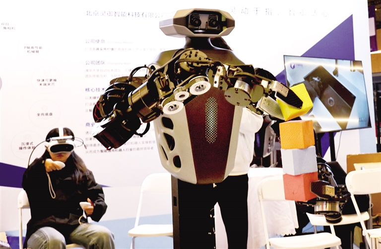 图为当日工作人员(后)与机器人配合进行悬空搭积木演示。