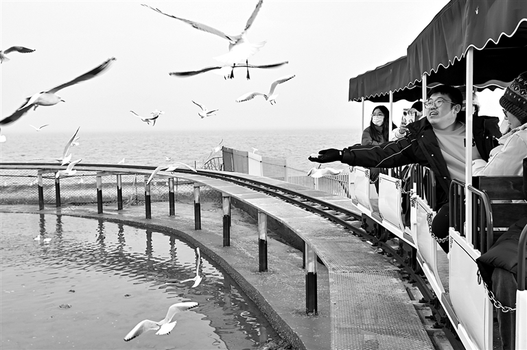 游人乘坐小火车喂食海鸥(12月10日摄)。冬日,在天津市滨海新区的海贝乐园,成群的海鸥在此聚集栖息,吸引众多游人前来喂食、赏趣。 新华社记者 李然 摄