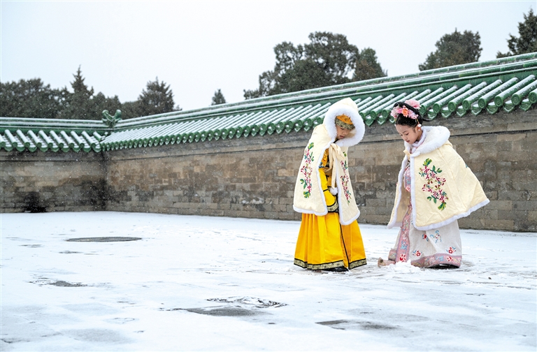 12月12日,两名小朋友在北京天坛公园冒雪游玩。