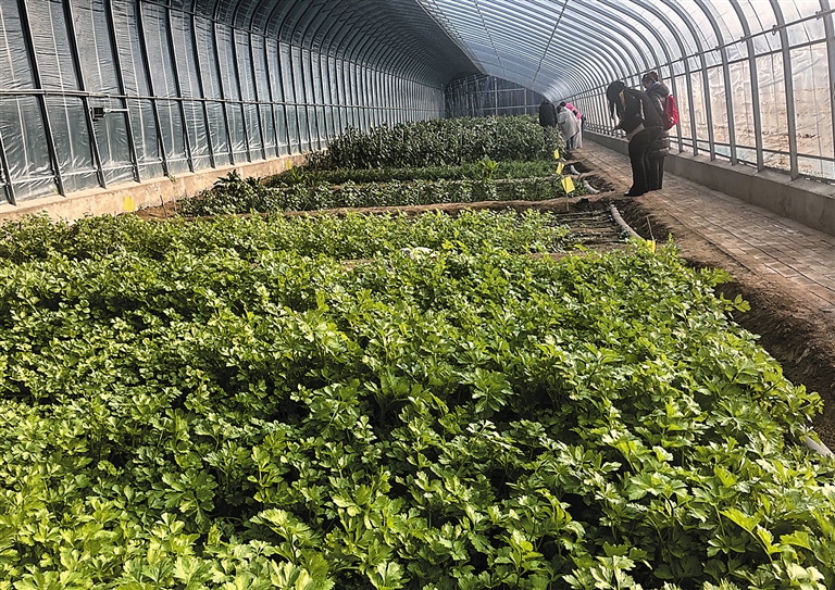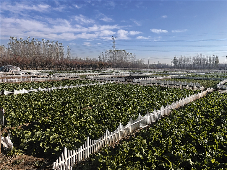 园区内,一栋栋温室大棚整齐排列。外面天寒地冻,棚内温暖如春,满地的油菜、茼蒿、茴香,绿汪汪的,散发着清新气息。