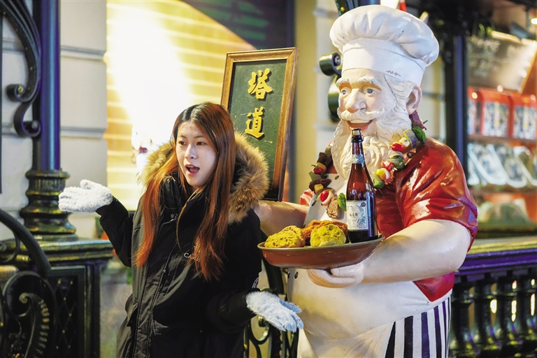 12月16日,人们在哈尔滨中央大街上打卡拍照。
