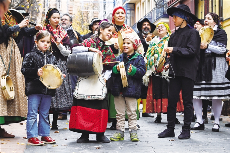 当日,来自西班牙马德里自治区及周边省份的传统民谣弹唱团与民俗表演队在马德里市中心街道上进行音乐巡游,通过演奏传统乐器和演唱歌曲营造节日气氛。