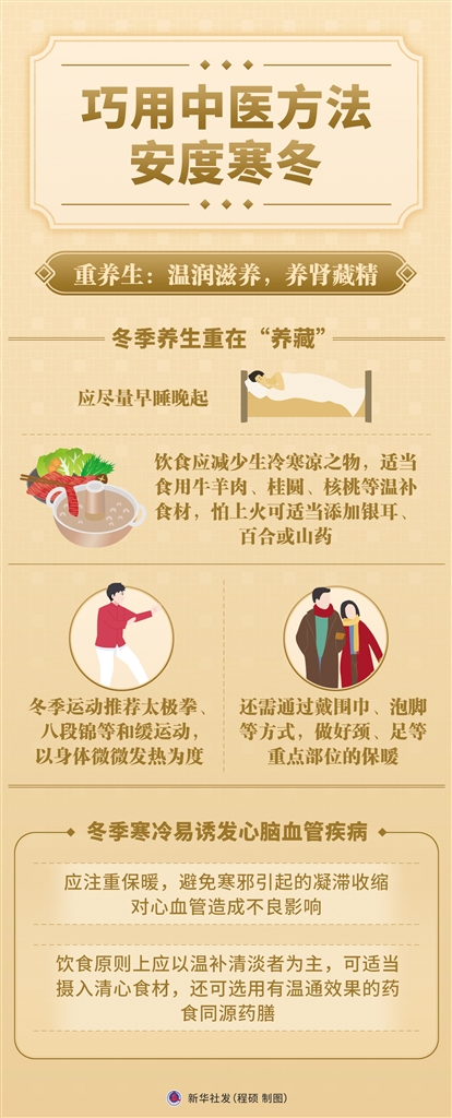 同时,冬季运动推荐太极拳、八段锦等和缓运动,以身体微微发热为度;还需通过戴围巾、泡脚等方式,做好颈、足等重点部位的保暖。