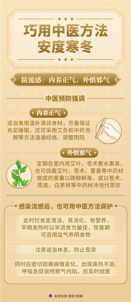 当前正是流感流行季。中国中医科学院广安门医院急诊科主任医师齐文升说,中医预防强调内养正气、外慎邪气,流感的发生取决于人体内部“正气”(免疫力)的盛衰和“疫戾之气”(病毒)的强弱,可以通过综合调养的方法巩固自身的“防御能力”。