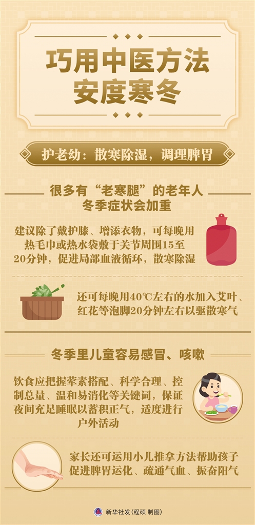 唐强建议,有“老寒腿”的老年人,除了戴护膝、增添衣物,可每晚用热毛巾或热水袋敷于关节周围15至20分钟,促进局部血液循环,散寒除湿;还可每晚用40℃左右的水加入艾叶、红花等泡脚20分钟左右以驱散寒气。