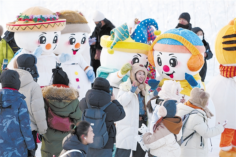 12月17日,在哈尔滨冰雪大世界园区内,游客与巡游队伍中的卡通形象合影。 新华社记者 王建威 摄