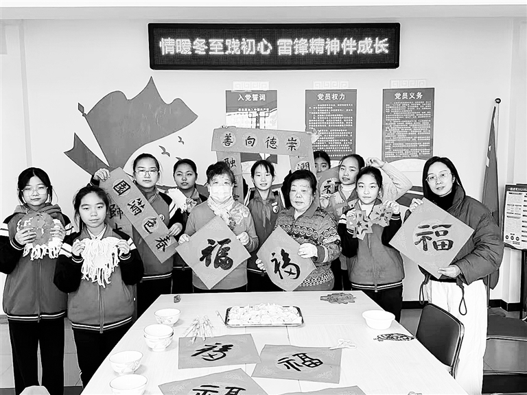 ▲12月19日,冀英学校携手金昌东社区开展冬至主题活动。小小志愿者化身雷锋精神传承人,带着在劳动课上亲手制作的杯垫走进社区,与老人围坐一堂,现场写福字、撰对联,一同揉面擀皮包饺子,共享美食与温情,让传统冬至暖意与雷锋精神温度在社区流淌。