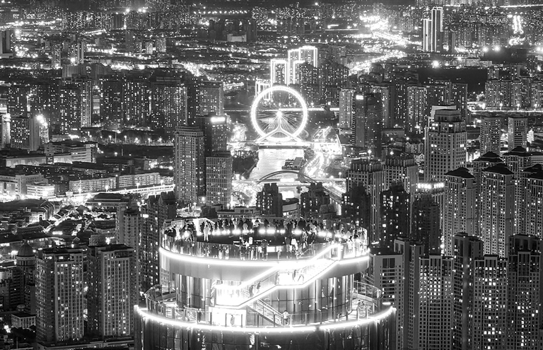 游人在津湾云顶高空观景台欣赏夜景(12月20日摄,无人机照片)。近日,位于天津市和平区津湾广场核心位置的津湾云顶高空观景台开始运营。游客可以登上300米高的楼顶,俯瞰天津中心城区。 新华社发