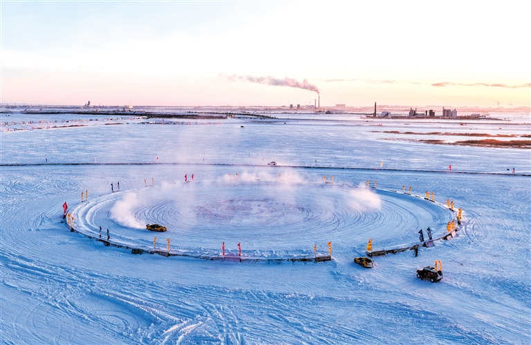 12月21日,车手驾驶赛车在冰面上漂移(无人机照片)。