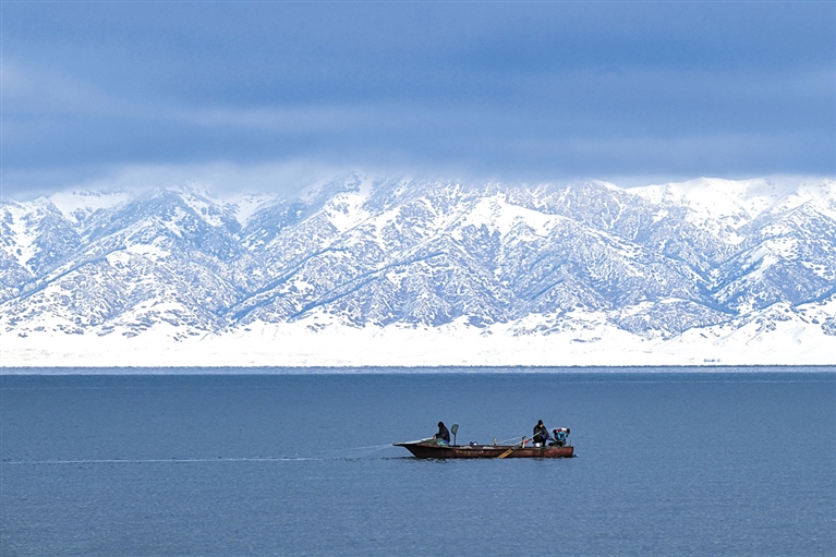 一条小船在赛里木湖中驶过(12月16日摄)。赛里木湖位于新疆博尔塔拉蒙古自治州,是新疆海拔最高、面积最大的高山湖泊。