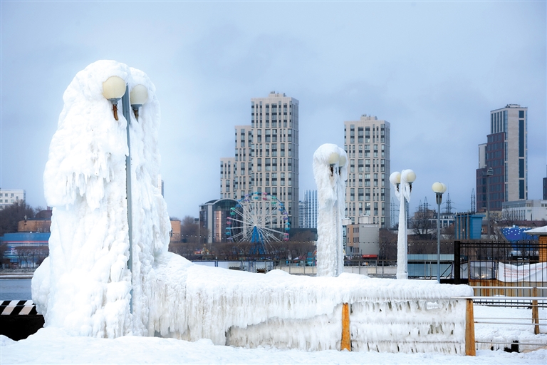 海风中裹挟的水汽遇冷后在海边的路灯、护栏等物体上凝结,形成冰挂和冰凌,是俄罗斯远东城市符拉迪沃斯托克冬季的标志性景观。