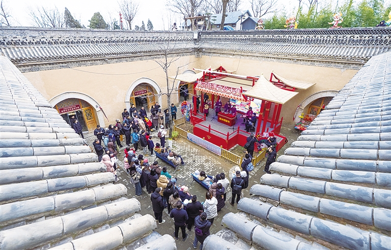 12月21日,游客在河南省三门峡市陕州区张汴乡北营村地坑院欣赏陕州锣鼓书表演。