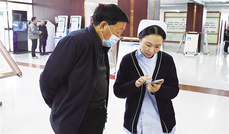 医护人员指导患者使用“保康通”智慧医疗平台。 受访单位供图