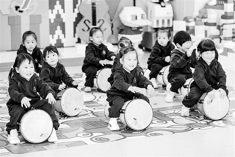 11月4日,在山东青岛恒星科技学院恒星托育中心,老师教托育班的小朋友学习非洲鼓。 新华社发(张鹰 摄)