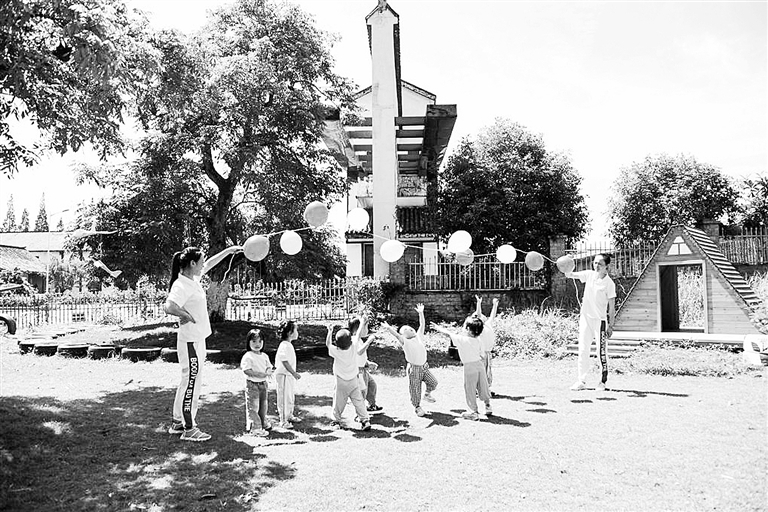9月5日,四川泸州白酒产业园区天骄托育园的老师带领孩子们做游戏。 新华社记者 江宏景 摄