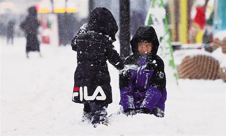 12月23日,小朋友在哈尔滨市中华巴洛克历史文化街区玩雪。