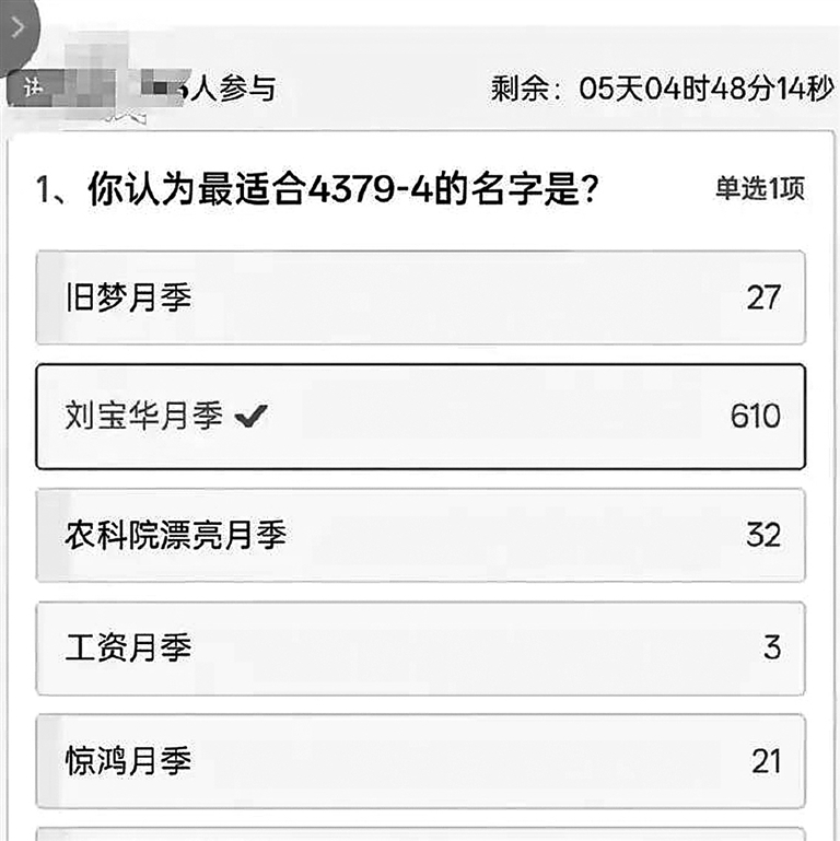 “国华,因为我二叔叫国华。”“亦玫,看到后第一反应,黄亦玫。”……网友的留言,并非无厘头的跟风,而是藏着一种情感投射。当网友们为“宝华月季”投票时,投出的不仅是对一个名字的认可,更是对身边平凡亲人的感念,对朴素生活的珍视。