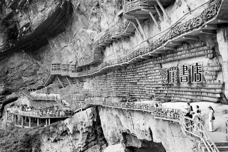 8月9日,游客在广西河池市罗城仫佬族自治县棉花天坑景区内的悬崖书店阅读游玩。 新华社发(龙涛 摄)