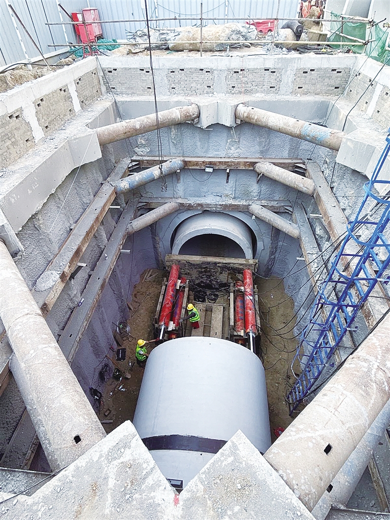 在防洪排涝施工现场,保定供水公司用液压千斤顶进行管道顶进施工。