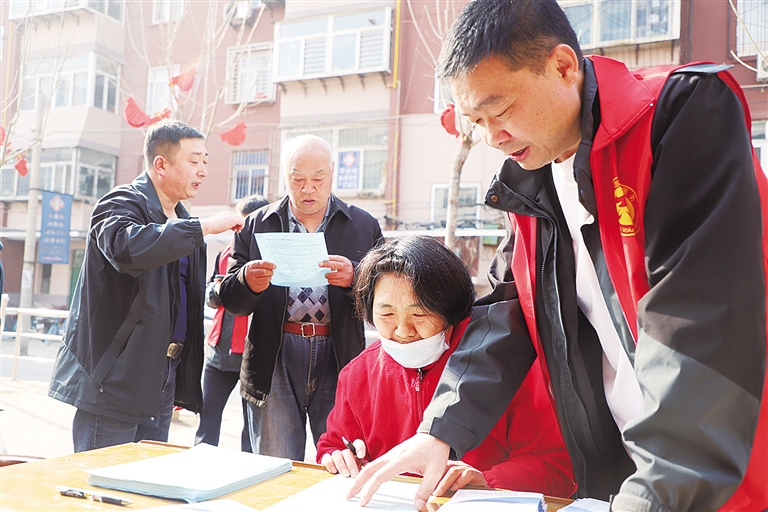 党员活动日当天,保定供水公司党员志愿服务队走进社区,为居民提供业务服务。