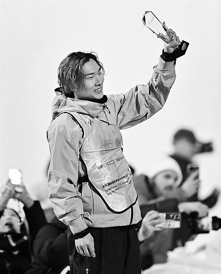 ◀2025年12月6日,中国选手苏翊鸣在2025-2026赛季国际雪联单板及自由式滑雪大跳台世界杯北京站单板滑雪大跳台男子组颁奖仪式后向观众致意。 新华社记者 陶希夷 摄