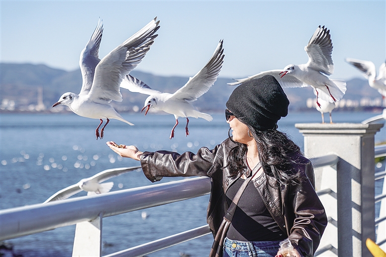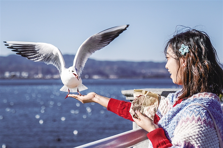▶▼游客在滇池畔喂红嘴鸥。