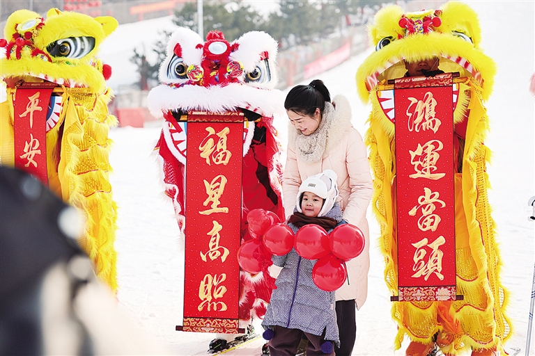 ▲在河北省石家庄市鹿泉区西部长青滑雪场,游客与舞狮队合影。 新华社发(张晓峰 摄)