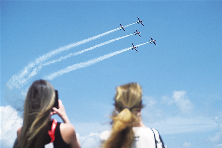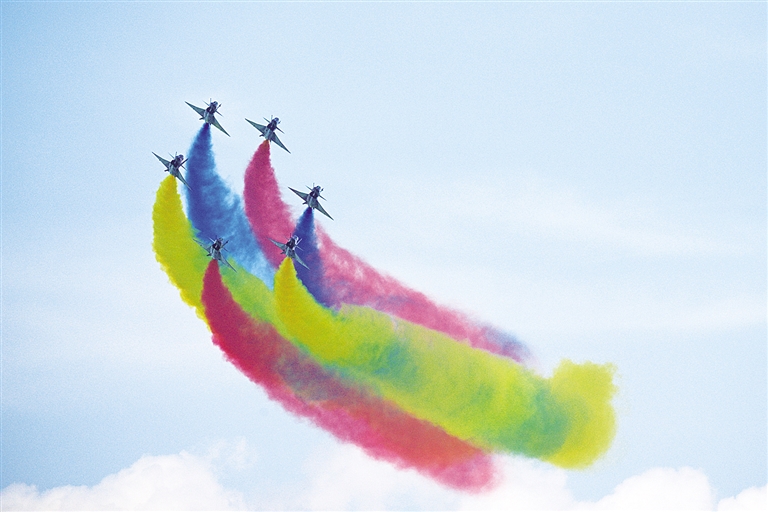 中国空军八一飞行表演队在第十届新加坡航展首日进行飞行表演。
