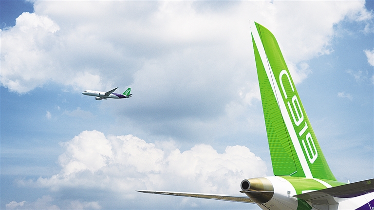 一架中国商飞C919飞机在第十届新加坡航展首日进行飞行表演。