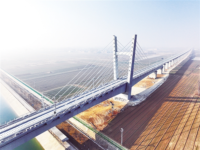 雄忻高铁进入铺轨施工阶段。图为雄忻高铁跨南水北调工程大桥(2月1日摄,无人机照片)。 新华社记者 朱旭东 摄
