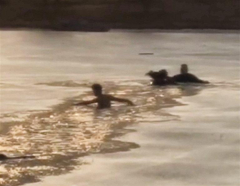 危急时刻,王雷(左)用肘部和胸部抵住冰层破冰游向儿童。