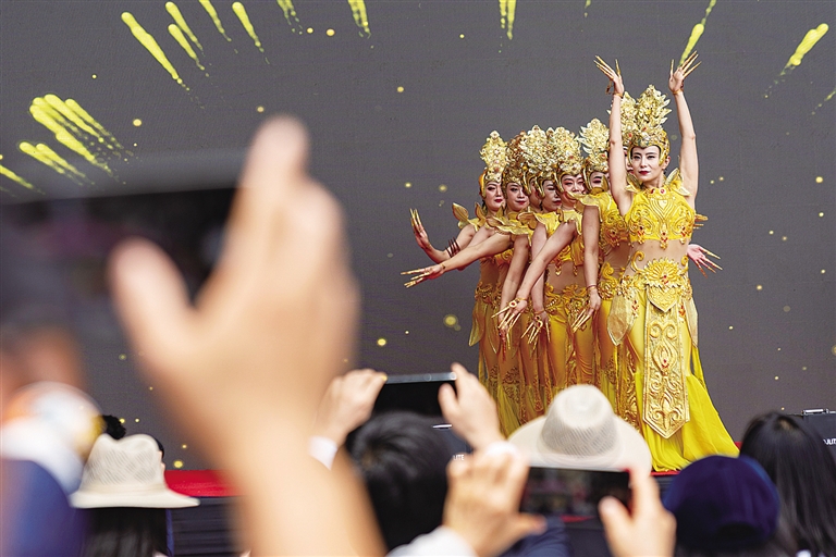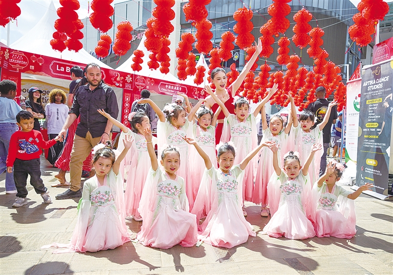庙会上,一家中国舞蹈社团的小演员们合影留念。 新华社记者 杨光 摄