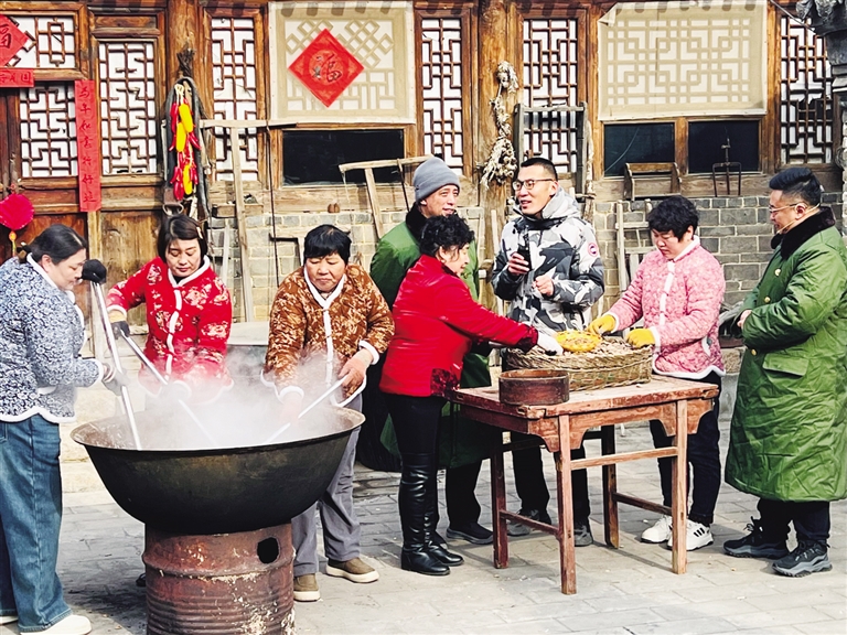 年集上,20余个展位琳琅满目,鲜活农产品、非遗手工艺品依次排开,直供直销的模式让游客满载而归。“以前只知道大龙门有摩崖石刻,没想到这里的年集这么红火!山杏仁香脆可口,压肉地道醇厚,不虚此行。”来自北京的游客王晓静提着刚购买的土特产,笑容洋溢。非遗体验区内,老师傅现场展示炸油香、煎血肠技艺,游客既可观摩学习,又能品尝热乎年味,传统民俗在互动中焕发活力。