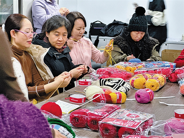 ▲志愿者在为孩子们编织衣物。
