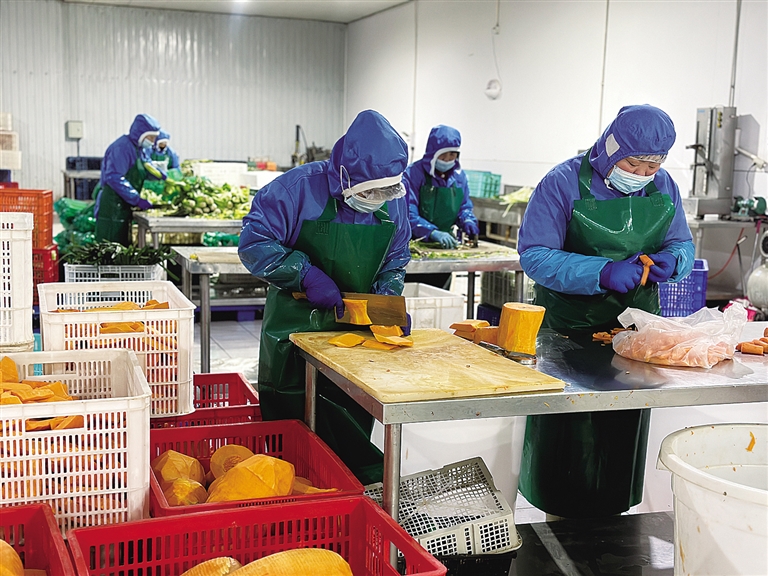 在加工车间,这份“稳定”转化为更多“家门口”就业的机会。家住厂区附近的王立萍一边麻利地分拣净菜,一边跟记者算起了自己的“幸福账”:“从家到这儿,走路就5分钟。一个月能挣3000多元,还不耽误照顾老人孩子。这活儿,干着踏实!”像王大姐一样,企业现有的近150名员工,几乎都来自周边村镇。