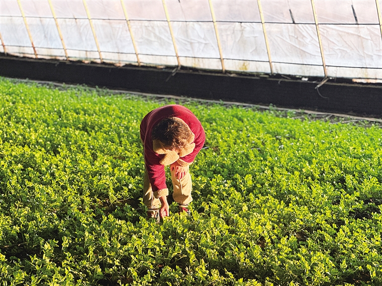 ▲刘永娟正在查看芹菜的长势。