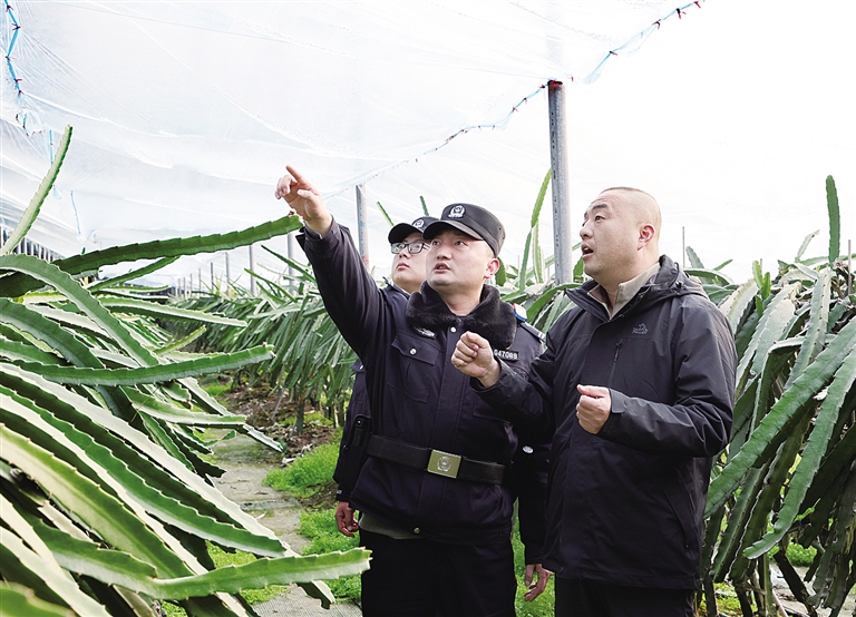 离园区不远的佳盛农场,火龙果大棚在冬日阳光下泛着暖光。“新农人”崔海川站在地头,把走访的方顺桥派出所民警连峰、辅警冯郎迎进大棚。连峰问:“老崔,最近轻松点了吧?能休息好了吧?”“别说现在农闲,就是采摘期,有你们在我心里也是踏实的。”崔海川指着一排排的火龙果枝干说。