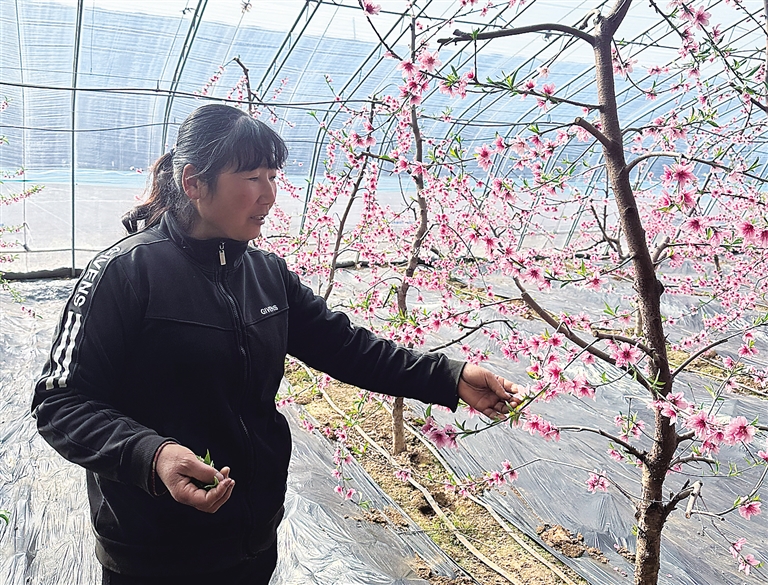 2月13日,天气渐暖。顺平县蒲上镇伍郎村桃树大棚里,村民张新未、王玉琴夫妻俩正忙着。棚内暖意融融、繁花满枝。“今年这花开得密,后期管护好,收成不会差。”张新未说。